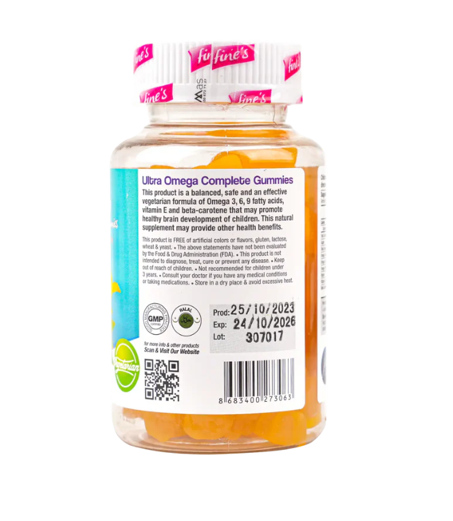 ادعم نمو طفلك وصحة دماغه وجسمه مع علكات فاينز ألترا أوميجا كومبليت للأطفال. تحتوي هذه التركيبة المتطورة على أحماض أوميجا 3 و6 و9 إلى جانب فيتامين E وبيتا كاروتين لتوفير دعم غذائي متكامل في شكل علكات لذيذة وسهلة المضغ.