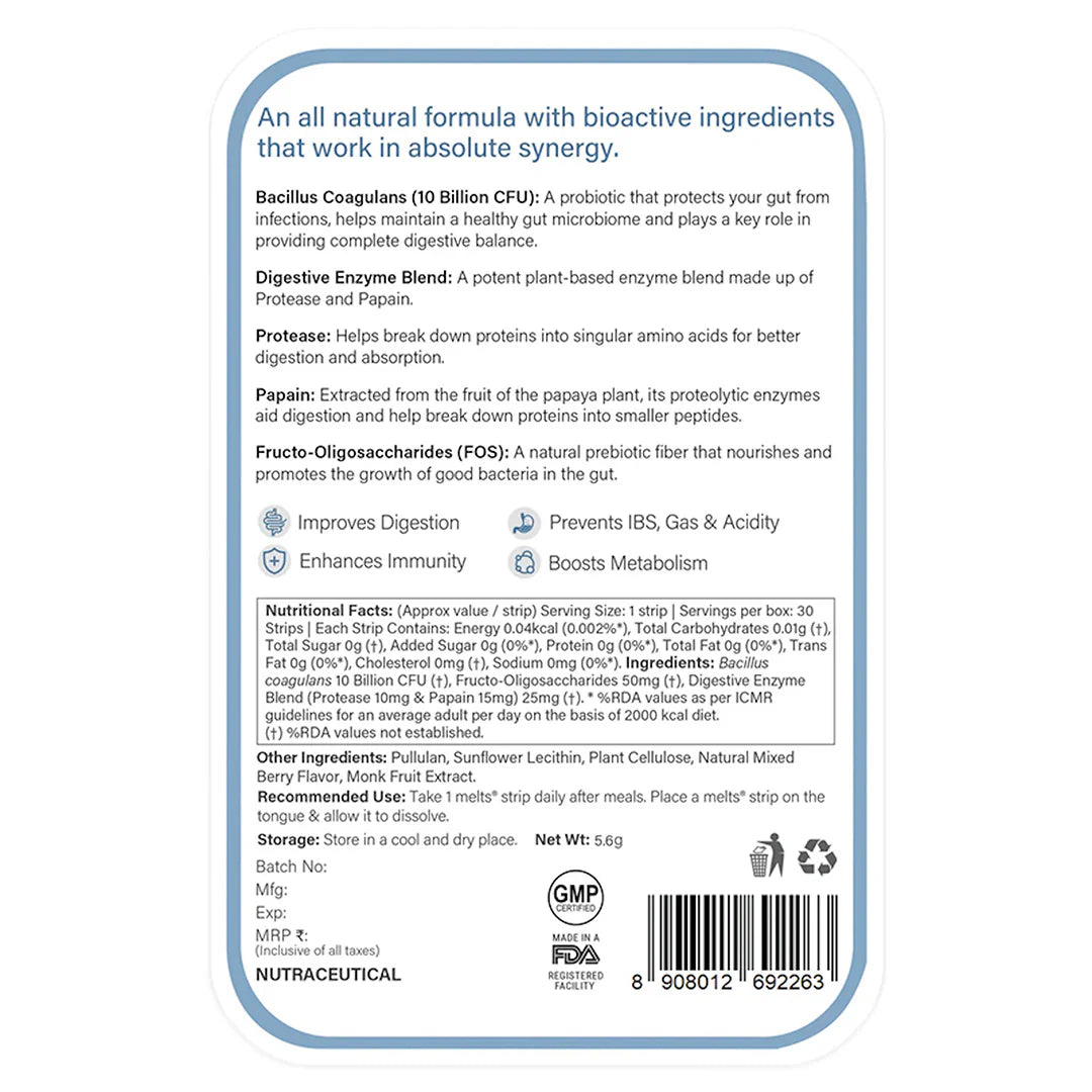 تساعد هذه التركيبة على دعم توازن البكتيريا النافعة في الأمعاء، وتقليل الانتفاخ، وتحسين امتصاص العناصر الغذائية، مما يعزز الصحة العامة. مثالية لمن يعانون من اضطرابات هضمية أو عدم انتظام في الهضم.