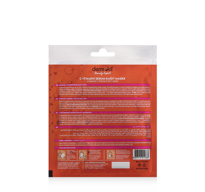 تم تصميم قناع ديرموكيل للوجه بالسييروم وفيتامين C لتنشيط البشرة الباهتة والمتعبة، مع معالجة تفاوت لون البشرة والبقع الداكنة. يحتوي على فيتامين C للحماية المضادة للأكسدة وتفتيح البشرة، Alpha Arbutin لتقليل البقع الداكنة، حمض الهيالورونيك لترطيب عميق، مستخلص الرمان لتجديد البشرة، وحمض الساليسيليك لتقشير البشرة بلطف وتحسين ملمسها.