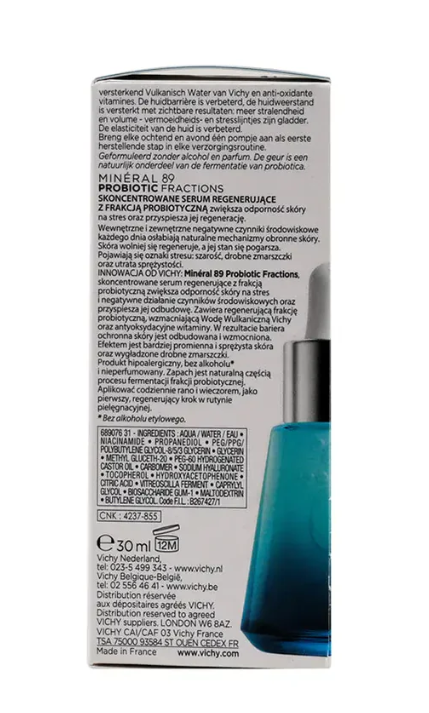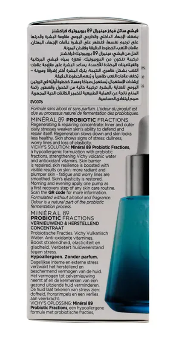امنح بشرتك الترطيب المثالي مع فيشي مينيرال 89 – تركيبة البروبيوتيك 30 مل، معزز يومي غني بأجزاء البروبيوتيك ومياه فيشي المعدنية. هذا السيروم الخفيف سريع الامتصاص يقوي حاجز البشرة، يعزز الدفاعات الطبيعية، ويحسن مرونة البشرة بشكل عام. مع الاستخدام المستمر، تبدو البشرة ممتلئة، ناعمة، وصحية، بينما يزداد الترطيب وتقل علامات التعب بشكل واضح. مناسب لجميع أنواع البشرة، ويعتبر الخطوة الأولى المثالية في روتين العناية بالبشرة لتحضير وحماية البشرة للمنتجات اللاحقة.