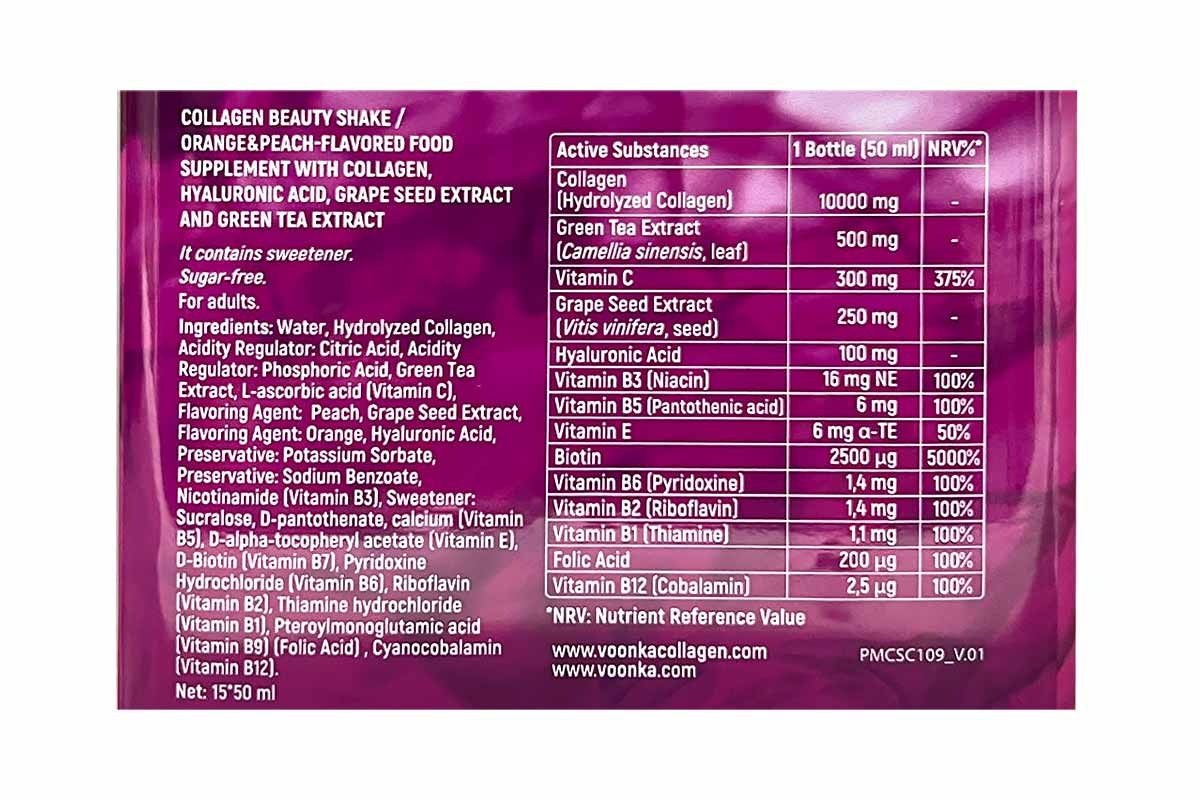 مشروب فوكنا كولاجين الجمالي هو مكمل سائل عالي الفعالية مصمم لدعم صحة البشرة من الداخل. تحتوي كل زجاجة على 10,000 مجم من الكولاجين المتحلل، مع تركيبة متكاملة تضم حمض الهيالورونيك، خلاصة الشاي الأخضر، وخلاصة بذور العنب بالإضافة إلى مجموعة مختارة من الفيتامينات الداعمة للجمال.