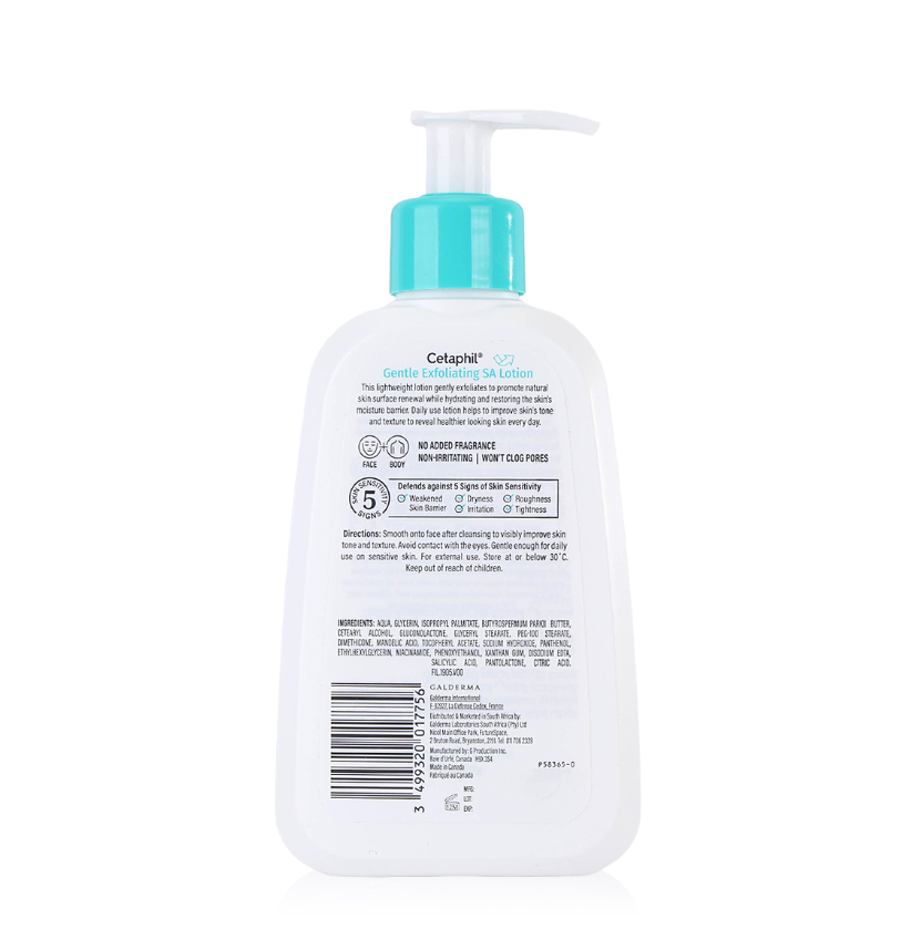 Achieve smoother, clearer, and healthier-looking skin with Cetaphil Gentle Exfoliating SA Lotion. Formulated with Salicylic Acid (BHA), this lightweight daily lotion gently exfoliates dead skin cells, unclogs pores, and helps improve skin texture without irritation.