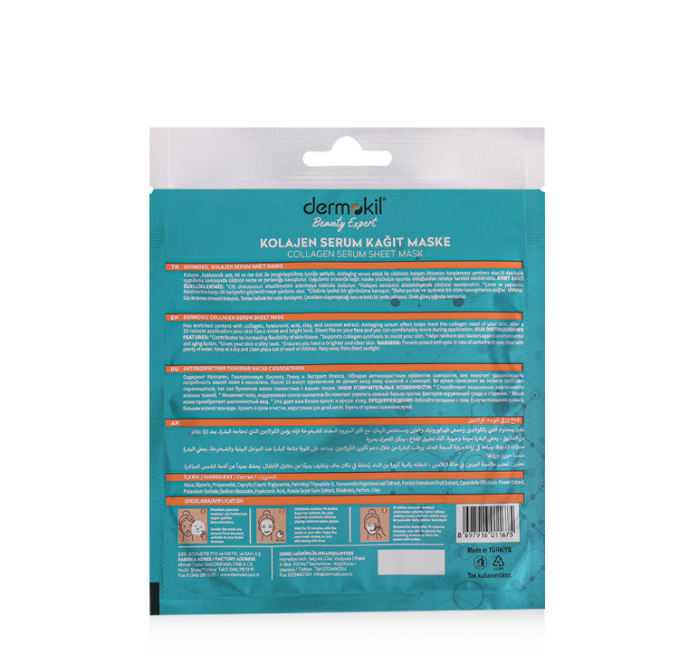 DERMOKIL Anti-Aging Collagen Serum Sheet Mask delivers intensive hydration while addressing early signs of aging. This mask is enriched with Collagen to improve skin elasticity and firmness, Hyaluronic Acid for deep hydration, Vitamin E for antioxidant protection, and Botanical Extracts like Aloe Vera and Green Tea to soothe and revitalize the skin. Experience visibly smoother, plumper, and youthful-looking skin with every use.