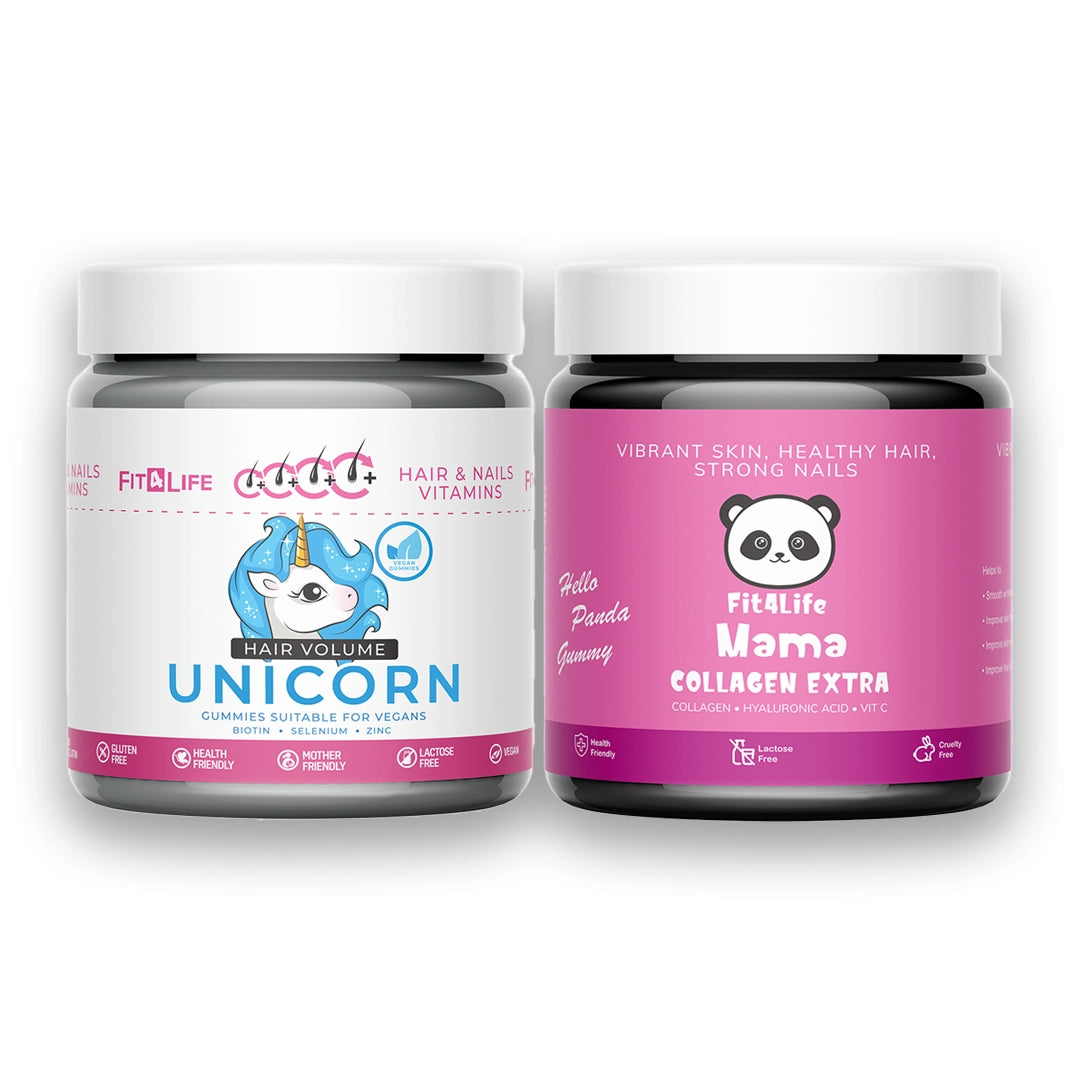The Fit 4 Life Hair, Skin & Collagen Gummies Set is a powerful daily beauty routine in a delicious gummy form. This carefully selected combination includes Unicorn Hair Skin & Nail Gummies enriched with essential vitamins and biotin, alongside Mama Collagen Extra Gummies, formulated to support collagen production and skin elasticity.